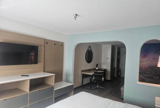 有 55 间客房提供冰箱和微波炉;您定能在旅途中找到家的舒适。您的加厚层卧床备有羽绒被和高档床上用品。带有有线频道的 40 英寸平板电视可满足您的娱乐需求;同时提供免费无线网络,方便您与朋友保持联系。配备淋浴/盆浴组合的私人浴室提供免费洗浴用品和吹风机。