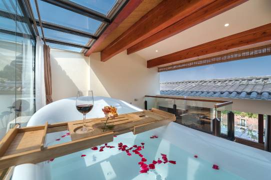 客栈为简约东南亚风格的建筑和装饰风格。房间为全实木家居,梦百合零压床垫、智能马桶、部分房间配有私密温泉泡池,全自动洗衣机,烘干机,床品皆选用纯白鹅绒的鹅绒被和枕头,给旅途奔波一天的您一个完美的睡眠环境。