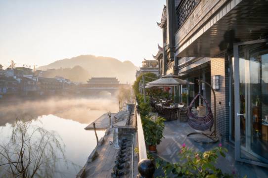 《凤凰山水莲心酒店》周边被山水环抱,沱江穿流而过,部分客房和酒店大堂吧的360°露天大阳台,可欣赏沈从文笔下的“烟雨凤凰”夜景,晨曦薄雾或华灯初上时,江景与古城的诗意尽收眼底。