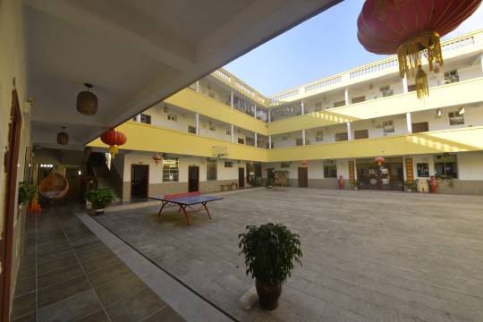 民宿是一座建在山坡顶的,仿方形围楼型制的现代建筑。中间一个大天井,有乒乓球台,简易蓝球架,可以避风打羽毛球,适合团建活动和爱好运动或休闲度假游客。该民宿的位置空气非常清新,自来水也是山泉水,不必买瓶装水。