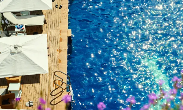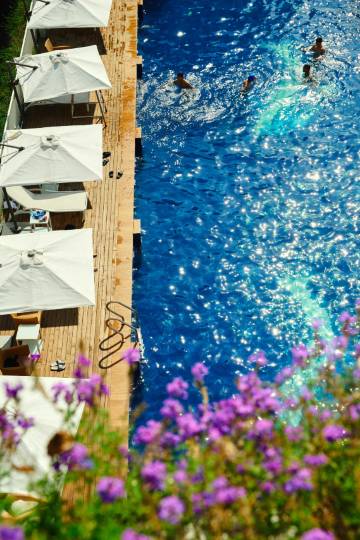 露台网红无边泳池是酒店特色之一,与不远处的太湖美景融合,在这里可以尽享嬉水之乐或是面对太湖放空发呆,出片率很高。入夜,酒店的文艺气息更加浓郁。一面6楼高的白墙体变身成为幕布,每晚都有露天电影放映,躺在阳台的椅子上就能观赏。同时,酒店常年有歌手驻唱,夜夜笙歌,氛围感十足。