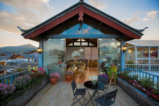 客栈为欧式乡村风格设计,以花卉为主题,分为前院和后院,分别由茉莉小镇中心花园、花园餐厅、屋顶花园三个不同视野的花园贯穿其中,宁静而舒适的院子布满各类花草,让您沐浴在花丛中,美得沉醉。屋顶花园可远眺玉龙雪山,束河古镇的美景也尽收眼底,花园早餐厅则被各类鲜花簇拥着。