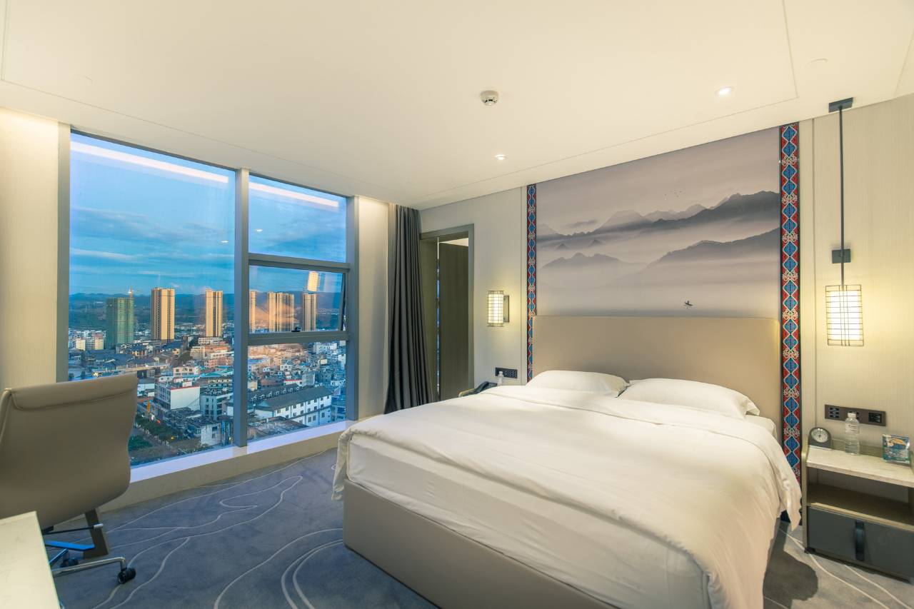 酒店楼体为全景玻璃幕墙,所有房间均能纵览城市美景。作为弥勒一家集商务、休闲度假为一体的国际品牌星级酒店,拥有各式客房共两百余间,包括三十余间套房、亲子楼层和行政楼层。