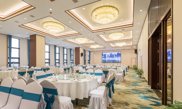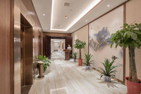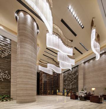 酒店外观气派巍峨,步入酒店,挑高大堂时尚华美,前台位置的大型背景幕墙吸引你的目光。