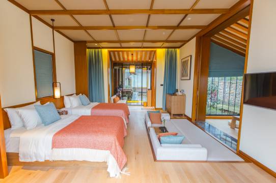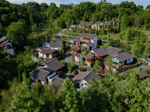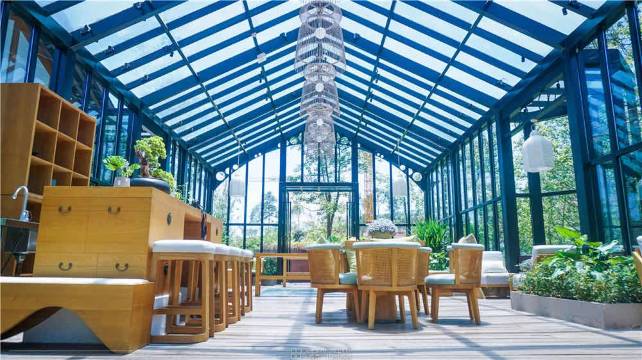 酒店分为8个组团。茴香餐厅、花鸟雀馆、户外泳池、儿童玩乐区、茶室、藏书阁、阳光花房、瑜伽房等全方位配套设施,为每一位花间堂的客人提供舒服、闲适的公共空间,期望人们在这里都真正地放松下来,享受散漫又安逸的川西生活。