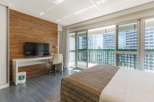 性价比极高。早餐丰盛美味,房间宽敞舒适,淋浴设施也很棒。酒店设有恒温泳池和健身器材。员工热情周到。地理位置优越,步行即可轻松抵达巴西利亚购物中心(仅500米)。