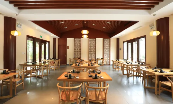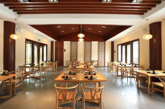 这里配套的孙武雅聚餐厅坐落在百米之外的圣湖边上,共设有3个包厢和60个雅座,整个装修风格与外围自然环境浑然一体,朴质天然中又增添着独特的风格。临水而坐,微风迎着湖面习习而来,有一种挽留世间的精纯美好,与世无争的幽眇情怀。