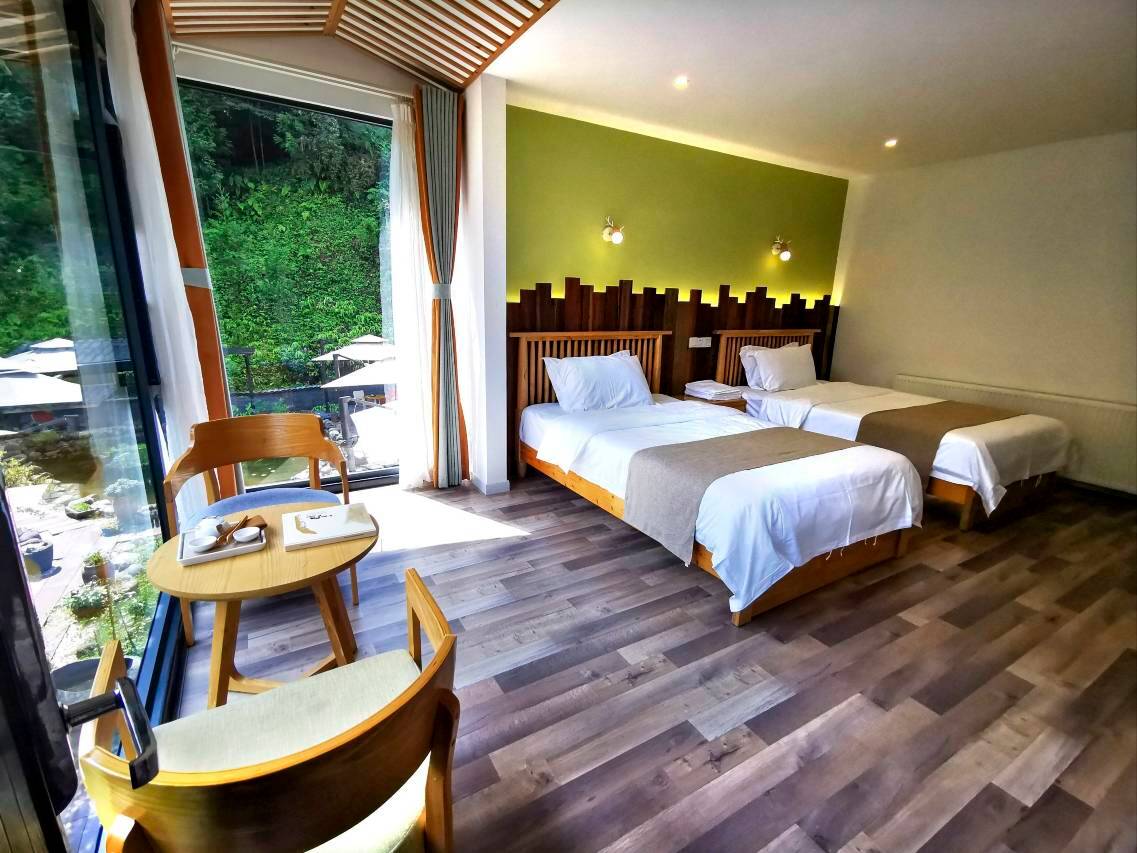 在雅女湖畔的瓦屋山六七山居民宿推窗即见碧波微漾,远眺平顶桌山倒映湖中,如坠水墨画卷。晨起烟岚缭绕,午后倚栏品茗观云卷云舒,暮色里枕水而眠听松涛低语。民宿内原木风设计简约温馨,出差到此地,本来一身疲惫,入住后身心皆沐自然的诗意,轻松惬意。