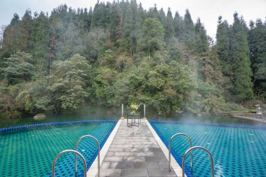 特色的无边际高温泡池坐落于翡翠湖边,被群山环绕,经过加温的山泉水含有多种矿物质,浸泡以后使人身心舒缓。
