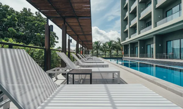 酒店比较新,设计有特色,泳池干净卫生,离机场很近,打车几分钟不怕堵,但是普吉岛打车起步价250猪,拖着行李路又不好走,还是老老实实打车。要去奈阳海滩看飞机的话,出门右转在711路口过街一直直走,就能到海滩,步行15分钟。酒店免费shuttle是拉到奈阳海滩游客区,离airport viewpoint较远。对了街对面还有一家麻辣烫,凑合能吃