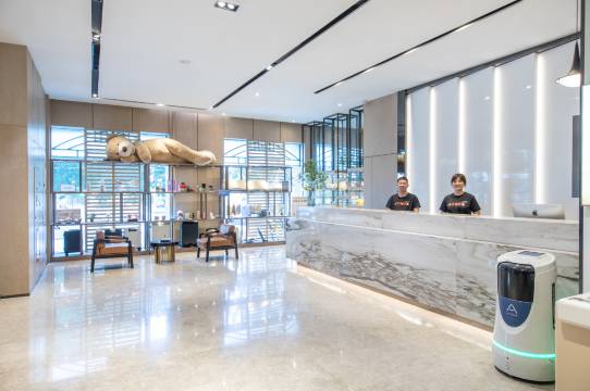 美中不足的一个是房间隔音不太好,走廊上的声音有点吵。另外小机器人上下楼会堵在电梯口,不让客人下电梯,有点尴尬。