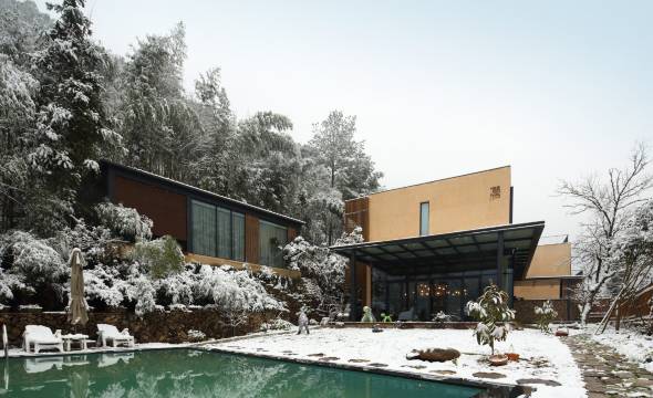 主体建筑由三个依山而建的长方形体块组成,上实下虚,开窗亦是在一定韵律基础上的方形落地大窗,极好的引入对面山景,每个房间都是山景房。