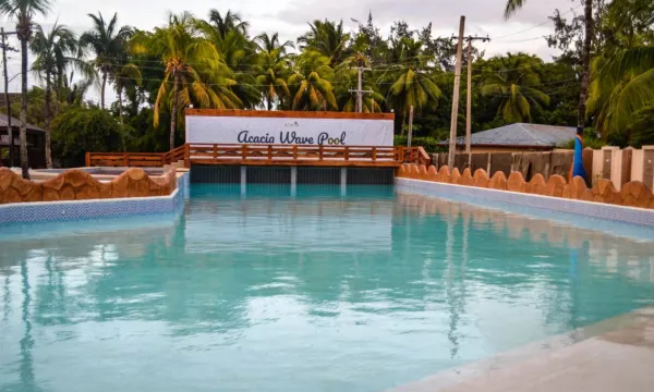泳池很大,孩子们很开心地过来玩水游泳,他们在造浪池玩得很尽兴,房间也很舒适温馨。