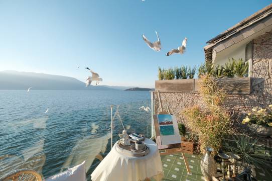 大理千里走单骑云何住海景酒店位于大理市双廊镇双廊村直至海边,近环海路,一线苍山洱海景。