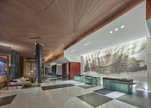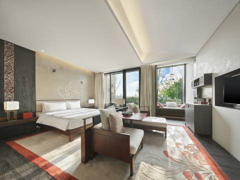 占地近400亩,酒店拥有186间40-400平方米不等的客房和套房,四面湖水环绕,是融合古今文化的高奢适度低密度园林酒店。酒店处处展现北宋元素、开封市花菊花主题,贝母扣龙亭大殿艺术墙、天青色瓷器接待台构成一幅“形入紫闼,而意在青云”的画卷,不仅成为网红打卡圣地,更是开启了“繁华之上,梦回东京”的探索之旅。