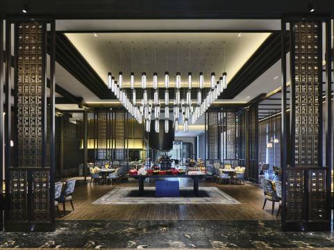 宋品全日制餐厅, 共设128个定制餐位,让您在用餐的同时领略浓郁江南韵味与互动厨房, 东西方美食品种荟萃,名厨悉心呈现,为您诠释别样的用餐体验;宋品中餐厅采用江南园林的建筑手法,临湖而建,中餐散座和包房空间上采用双级大开合坡顶木制结构,空间高挑舒适,沉稳大气, 落座其中透过格窗可观赏180度湖面美景。餐厅主理淮扬风味及山珍湖鲜, 由名厨团队悉心烹饪,为锡城食客带来舌尖盛宴。