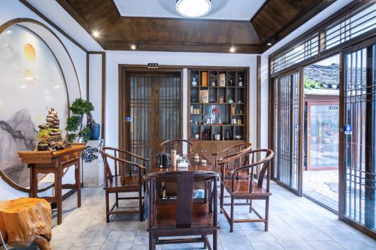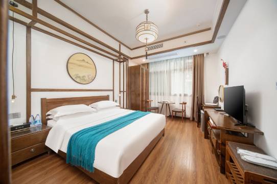 预订的河景房完全超出预期,超大观景窗正对着河道,晨起看薄雾缭绕河面,渔船点点;傍晚赏夕阳染红屋檐,灯笼次第亮起,河面上光影晃动,美得像一幅流动的水墨画。房间布置雅致,老榆木家具带着温润质感,棉麻床品柔软亲肤,复古茶具和窗边绿植相映成趣,细节里满是用心。