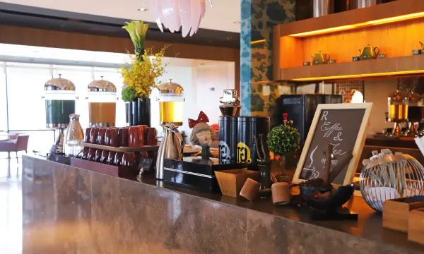 酒店2020年完成装修,外立面的玻璃幕墙在阳光下有现代感;大堂采用大理石搭配金色艺术纹饰设计,还摆放着玉雕摆件,挑高的空间让整体显得轻奢又大气。