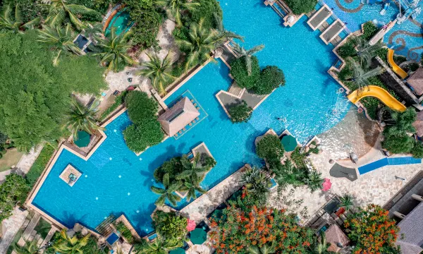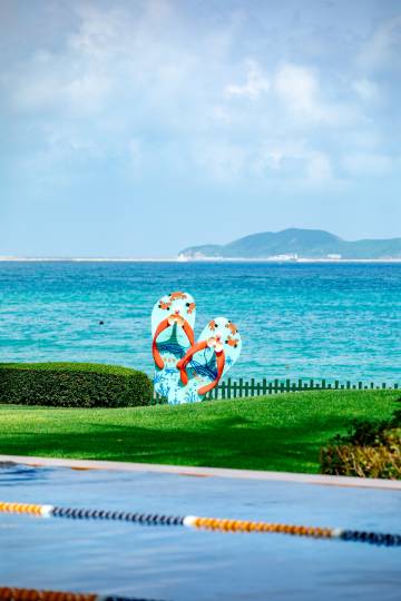 酒店是一线海景,房间步行约2-3分钟可直达沙滩,可下海游泳。有各式各样的海上运动项目,有潜水、香蕉船、帆船及水上游艇等。酒店拥有5个户外泳池。包括1个临海泳池(瑶池),1个绿洲吧泳池,1个环礁湖泳池,1个按摩池及1个儿童泳池。其中冬季开放室外恒温泳池(瑶池),冬季恒温为28℃-30℃。室外恒温泳池受天气影响,故开放时间将视天气调整而不另行通知。