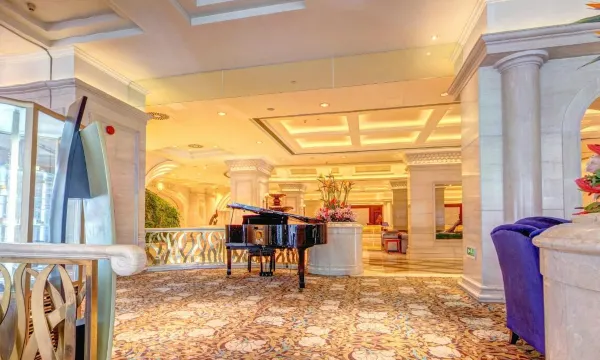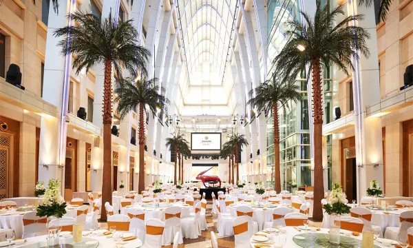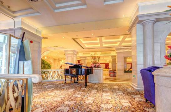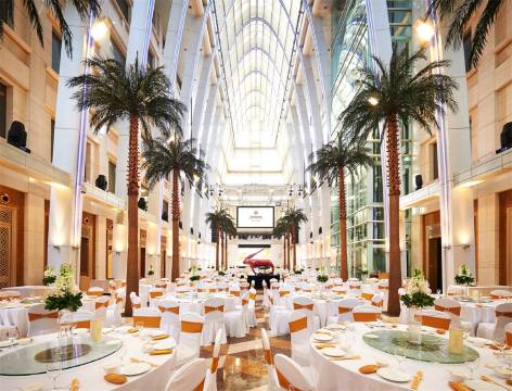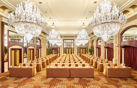 酒店拥有9个不同大小会议室和宴会厅,可满足不同类型的会议,其中面积800平米的金色大厅位于酒店3楼,24米的庭高,全玻璃穹顶,法拉利钢琴,时尚先进的设备。