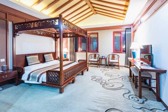 酒店位于燕都古城,地理位置优越,楼下很热闹,停车位比较充足,楼下还有一条风景优美的北易水河,房间古色古香,设施挺考究、干净,可以收看卫视节目,自助早餐味道清淡,服务员热情、大方,值得再次入住。
