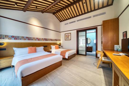 共占地3000平方,配备餐饮包厢、多功能会议室、ktv棋牌、室外泳池、景观池塘、萌宠乐园、榻榻米图书馆、休闲垂钓、农耕体验和采摘等区域和功能。客房都配备地暖,智控家居和智能马桶,全天候管家和跟拍制作团队贴心服务。是团建、亲子、研学等主题活动的不二之选。
