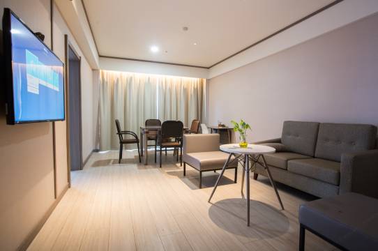 房间空间比较大,空调制冷效果好,有洗衣房特别适合我这种出差的人。卫生打扫得干净,服务也很热情,安排的房间深得我意,停车场大,停车方便,环境优美,不嘈杂,住得很满意。