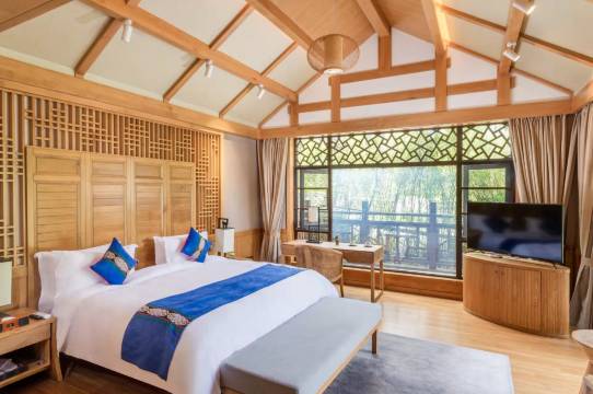 房间在乡愁贵州最里面,非常安静,周围青山环绕,拿本书可以过一天,太适合节假日放松型的度假。想接触一下烟火气,就有酒店观光车接送,几分钟又可以到商业区或景观区,非常方便。
