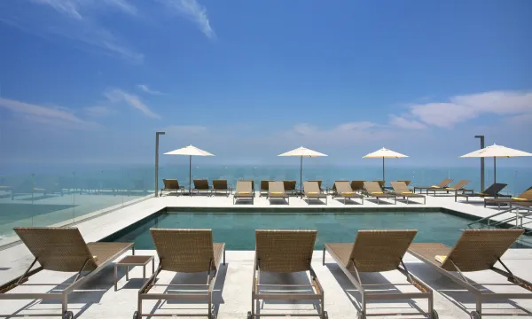 泳池水温适宜,环境很适合家庭入住,泳池边的酒吧也很棒。