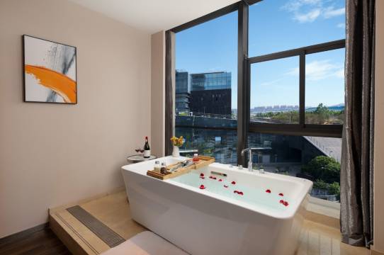 这次住的大床房太惊喜!房间干净整洁,床品柔软舒服,卫生间干湿分离,超大浴缸泡个澡超解乏,还配了一次性浴缸套,细节拉满~