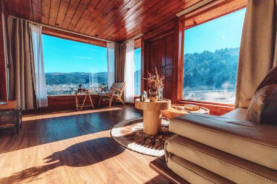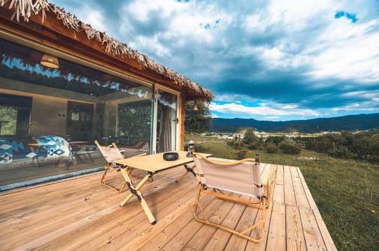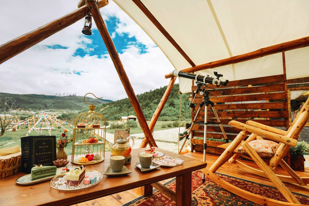 庄园将藏民古老传承的帐篷建筑与现代顶配酒店的设计理念相结合,打造出别具一格的原生态野奢全景独栋客房,拥有匹配建筑艺术的四顶方木帐篷、牦牛毡布墙围、老木雕大床、绘制地毯、工雕梳妆镜、老皮雕箱具等全套藏式家具,配备韩国进口水暖床、舒适床品、全屋地板、品牌卫浴等星级酒店设施,并设立原生态餐厅,可提供快乐奔跑藏香猪、原味野生牦牛、跑山土鸡、烫皮黑山羊等独有特色火锅。特别在2020年由IDA年度国际设计奖获得者亲手打造的环山景露台帐篷房,成为抖音破5000万点击的网红打卡房。