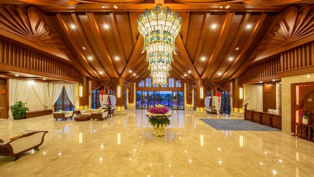 酒店拥有百余栋精奢东南亚风情独栋别墅,每栋别墅配备专属高端泳池,别墅园林设计上保留了原有的生态植被,负氧离子浓度高达8200个/cm3,将椰林、灌木、水体完美结合,打造出一个具有东南亚风格的原生态空间。