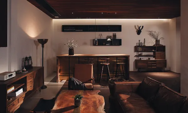 复古原木家具、旧时皮质沙发、整木做成的茶几、做旧的黑铁壁炉,填满这片慵懒的空间,喝一杯咖啡吃点零食点心便是最惬意的度假生活。