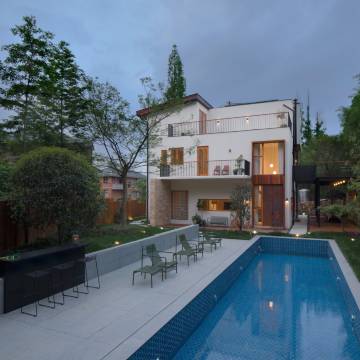 孩子们则彻底爱上了门口那个清澈见底的游泳池,玩得很开心。民宿本身也很有设计感,装修大气又别具一格,空间也非常开阔。