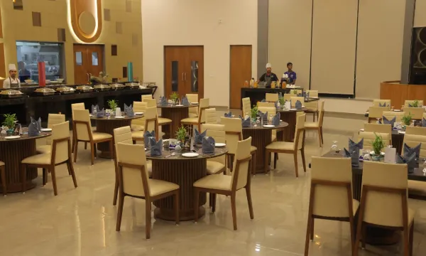 您可以到餐厅享用一顿美餐,也可以待在房间里,享受酒店的 24 小时送餐服务。