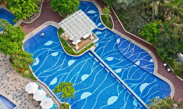 顶楼的泳池虽然不大但景色很棒,人少时体验非常好,是放松和拍照的好地方。健身房设备能满足基本锻炼需求。酒店的整体园林绿化也做得不错,公共区域干净整洁,漫步其中很惬意。