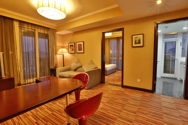 房间宽敞,设施齐全,交通便利。早餐丰富。服务人员热情好客。在小区里的公寓式酒店,房间安静,空调给力。前台接待看带了孩子,免费升级了大一点的床!很贴心。