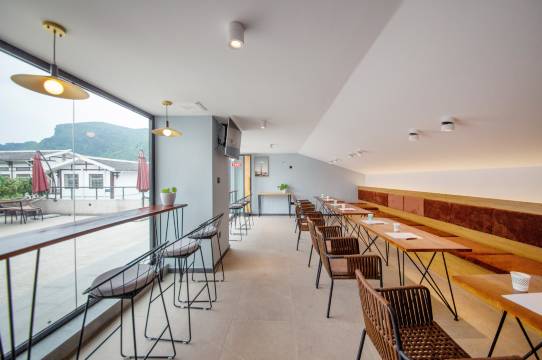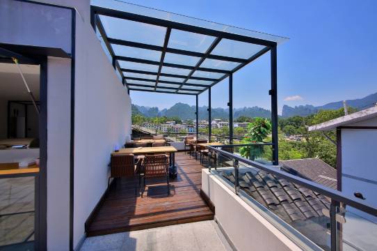 2、早餐:在六楼露天的平台,种类不算太多,有粉面、豆浆、鸡蛋、玉米、红薯、粥。但是六楼风景还不错,吃着早餐看着山蛮舒服。