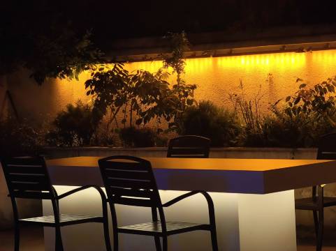 拥有三个院子:一个前院,适合看电影、喝茶喝咖啡。一个餐厅庭院,适合户外用餐、自助烧烤。一个后院,有游泳池、小酒馆、麻将房、独立茶室。适合晚上休闲、K歌、微醺一下。