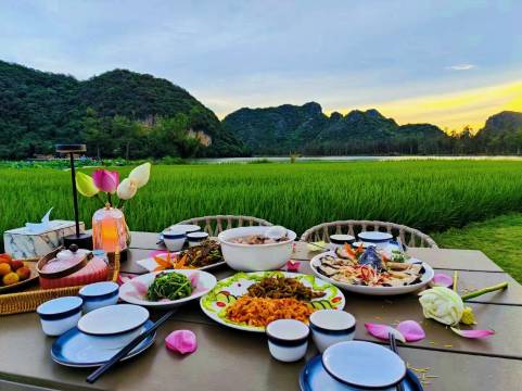 服务非常热情 早餐吃的很饱 比正餐还合胃口 一进房间就看到超大观景窗 对面就是普者黑青龙山,步行15分钟左右就能到达青龙山 上山的观景平台景色非常好 还能看见酒店