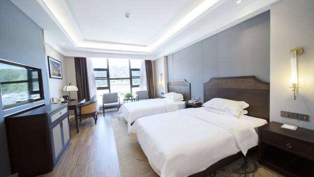 房间很大,设计很有特色,也很干净,普通双人间能够有豪华行政套房的设施,沙发桌子都有,位置绝佳,视野开阔,景色美,出门就是美食街,停车方便,对新手司机和女司机绝对友好,车爱怎么停就怎么停,在山区酒店里可以排第一。早餐特别丰富,还提供了烧烤和玩水的地方,适合带孩子来玩和疗养身心。