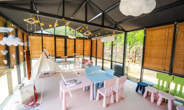 花园里配备有玻璃餐厅,活动及运动场地,可承办各类仪式活动,如公司团建,小型婚礼,篝火晚会,室外KTV,露天影院等。