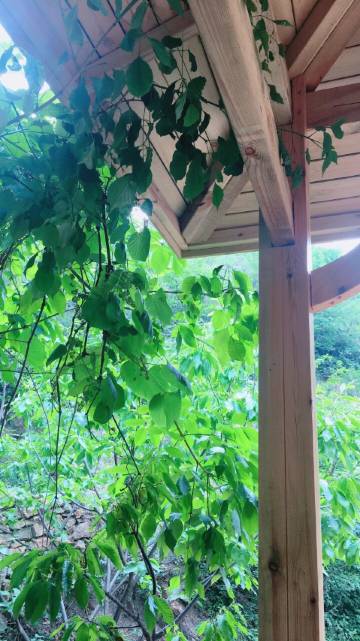 大山里的能量很纯净,是纯粹的木屋,有两个小平台,一个是可以唱KTV的,一个有个小秋千,很放松。在高处的小平台上看对面山谷,视野很好。