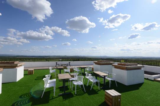 酒店拥有多种房型客房及带有落地玻璃窗与宽阔弧形露台的草原景观房等多种房型。内部装修采用原木、沙壁漆、棉、麻等素材,外部满是蓝天白云、青翠草原的场景。再加上数个错落有致的楼顶观星露台,整个民宿的打造舒适、宜居,散发着浓郁的文艺格调与自然情怀。
