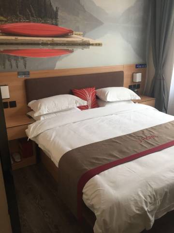 我们一家是对环境非常挑剔,但是这家可以说环境非常的干净,没有任何挑剔的毛病,床面整洁干净,卫生间典雅卫生,整个房间体现出美好的感觉。特别是早餐,除了尚客优都有的,他还可以自己动手做馄饨,方便面等,方便之处还在于它的周围全是饭店,吃饭相当方便。