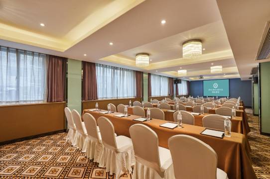酒店由HF风恒国际机构负责设计,独幢扇形大楼,楼高八层,建筑面积8000平方米。酒店大面积使用精选白玉、黄龙玉装潢,雕栏玉砌,轻奢涵儒。各式玉器摆件剔透玲珑、多类白玉拼接匠石运金,拥有百余间温馨客房,配有加厚地毯、自动感应门锁、恒温高端卫浴、天然乳胶记忆床垫,让您整晚舒适睡眠;十种房型选择满足各类客户需求,主打豪华房型给您和谧体验,设有100人剧院式会议厅,携多功能会议室,餐厅提供丰富馋涎的美食无论商务出差,观光旅游,参展布展,还是亲子游,酒店均是您的睿哲之选。