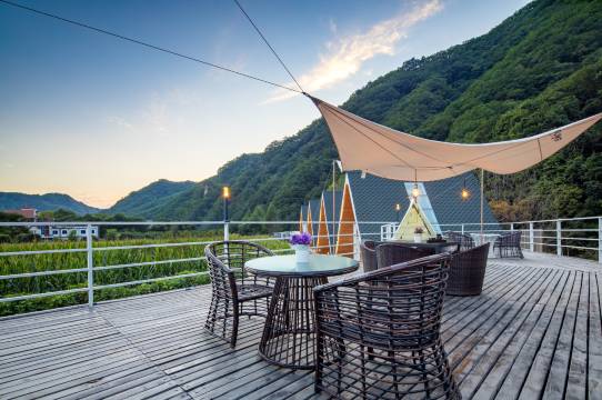 小木屋依山傍水,里面分为上下两层,造型结构奇特,深受小朋友喜爱。面向小河的屋外有温泉浴缸,可以对着青山碧水泡澡放松身心。当然夏季室外会有一些小虫子,可以理解。