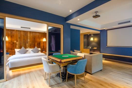巨幕大床房的窗户是对楼的 看不到远处。 屋里没有桌子和凳子 不适合在屋里吃饭。 那个不知道是不是冷藏柜,反正不好使。别的都挺好,温泉很棒,大投影也不错。