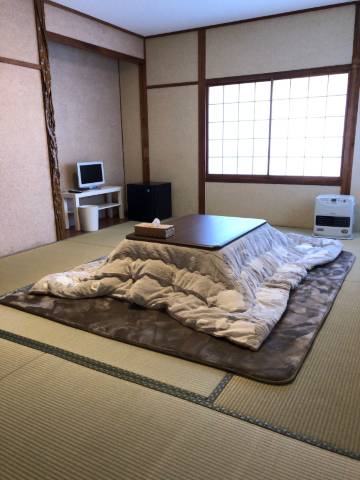我住的是单人间,榻榻米房间很宽敞,有种怀旧的感觉。日式暖炉(Kotatsu)和煤油取暖器的组合真是太棒了。卫生间是共用的,房间里没有淋浴,但附近有很多温泉,所以这不是问题。提供毛巾这点很实用。