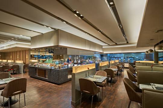 全天开放的铂雅西餐厅备有世界风味的自助餐和零点菜单供来宾选择。品珍轩中餐厅为您提供中西合璧式的本地美味佳肴。830平米无柱宴会厅加之专业的宴会管理和餐饮 服务团队,为您定制宴会。